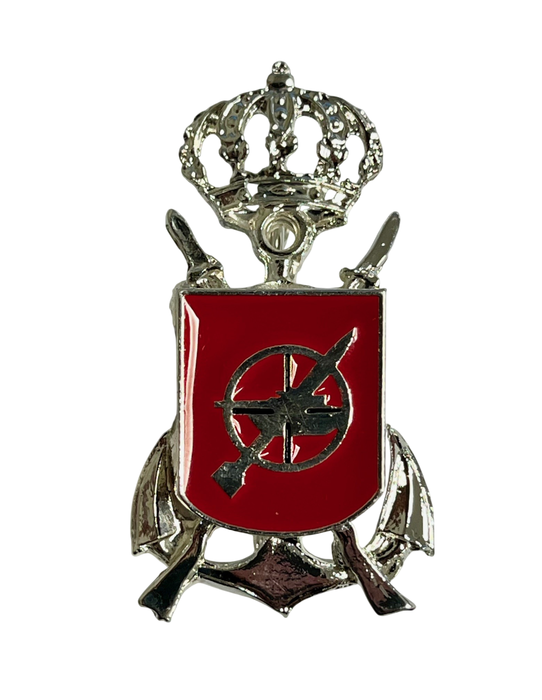 Formado por dos fusiles armados con machetes, en aspa sobre ancla (similar a la del emblema de la Armada excepto el cepo que estará en posición horizontal) timbrada de corona real. Todo de plata.