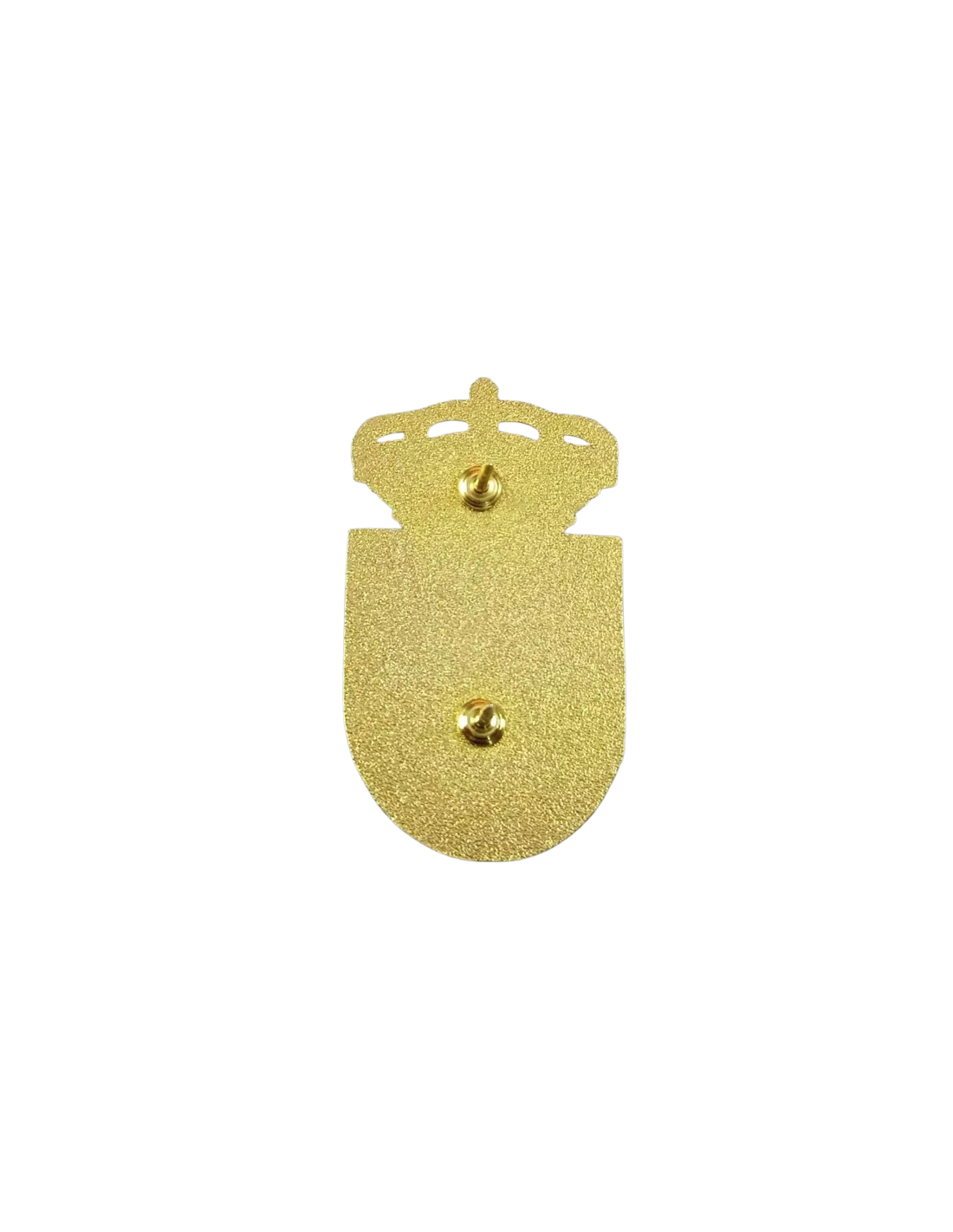 Medida: Distintivo compuesto por un escudo español, cuadrilongo de dimensiones 25 x 30 mm, redondeado en punta por un arco de circunferencia de 12,5 mm de radio, y timbrado por la corona real de España, de dimensiones 16 x 25 mm.