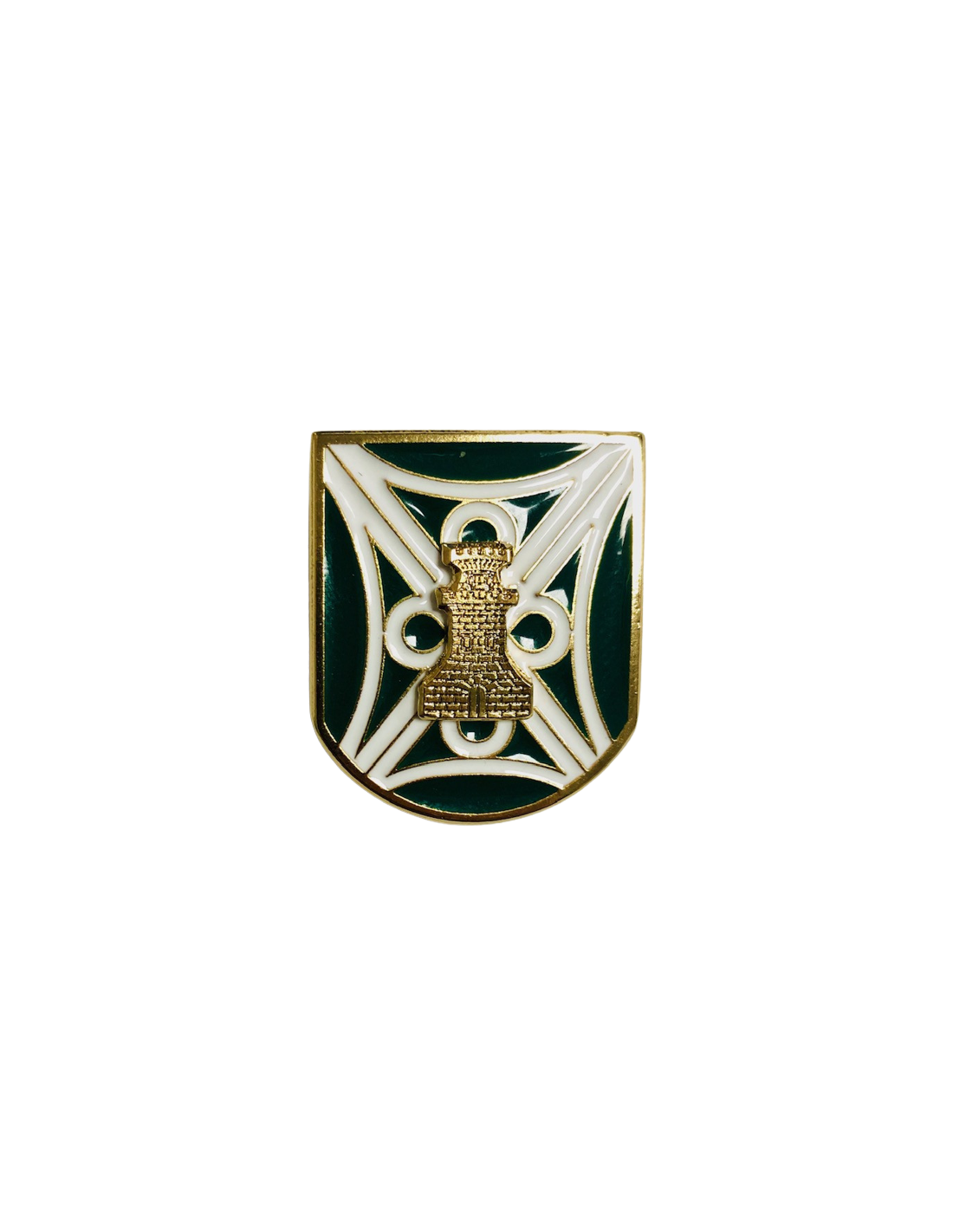 Escudo español cuadrilongo, redondeado, de 30 mm de altura y 25 mm de ancho, siendo su lado inferior un arco de circunferencia de 14 mm de radio. Llevará un borde interior de 1mm de ancho de oro. Sobre fondo verde, esquema de un nudo de comunicaciones o enlace de dos carreteras en plata con las medianas en oro. Superpuesto y en el centro, figura el castillo en oro del emblema de Ingenieros