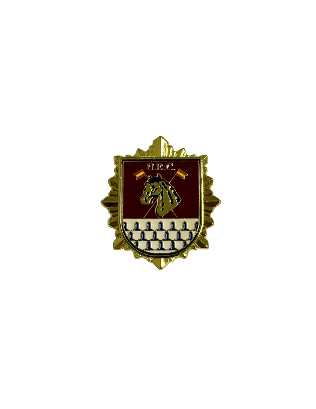 fileteada de oro, una campaña sembrada de veros menudos. En el corazón, sumada, de oro perfilada de sable, una cabeza de caballo, diestrada, fijada, animada y desguarnecida, resaltada sobre dos lanzas de oro, con sendos vexilos enarbolados. En el centro del jefe, alterado, anagramado de oro, compuesto con el siglónimo "U.E.C." (Unidad Especial de Caballería).