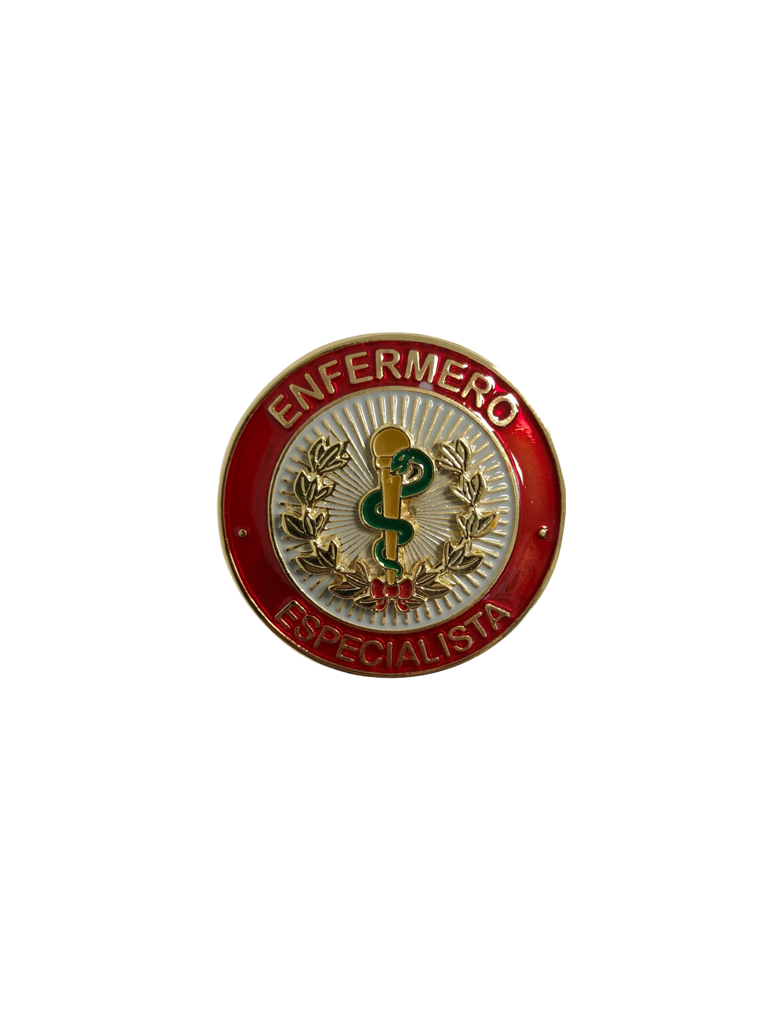 Especialidades complementarias correspondientes a la especialidad fundamental «ENFERMERÍA» (Figura VI). En campo de gris un caduceo de Esculapio con basto en marrón y áspid en sinople, acompañado por dos ramas de laurel curvadas a diestra y siniestra, liadas y atadas en su base con una cinta, todo ello en oro. Bordadura en gules, con la leyenda: «ENFERMERO» en jefe y «ESPECIALISTA» en punta.