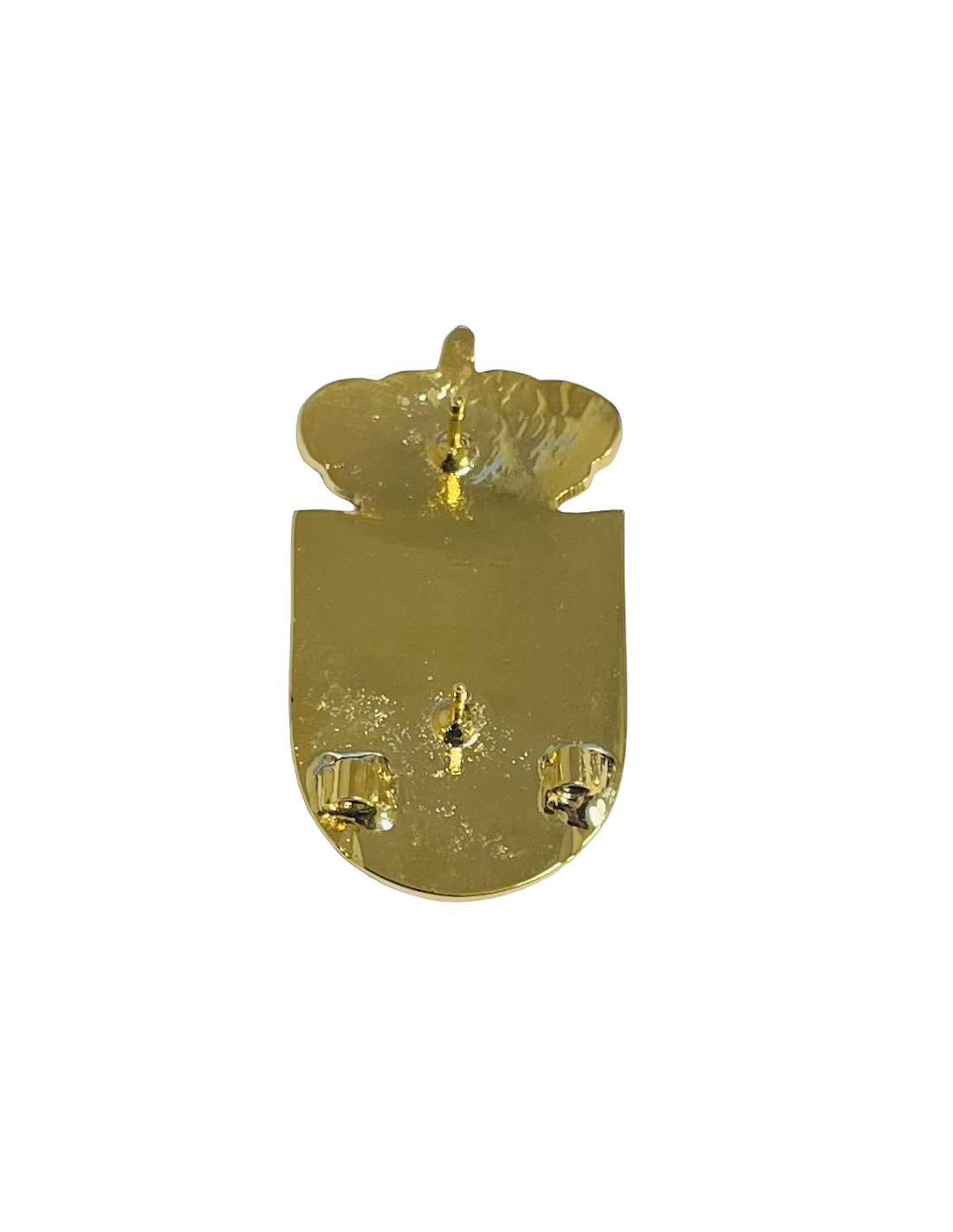 Escudo español, cuadrilongo redondeado en punta. Tronchado. Primero, lleno de gules (rojo). Segundo, lleno de sable (negro). Sobre el todo, aspa de Borgoña de oro, resaltada de un misil alado de lo mismo, perfilado de sable (negro). Boca fileteada de oro. Al timbre, corona real de España.