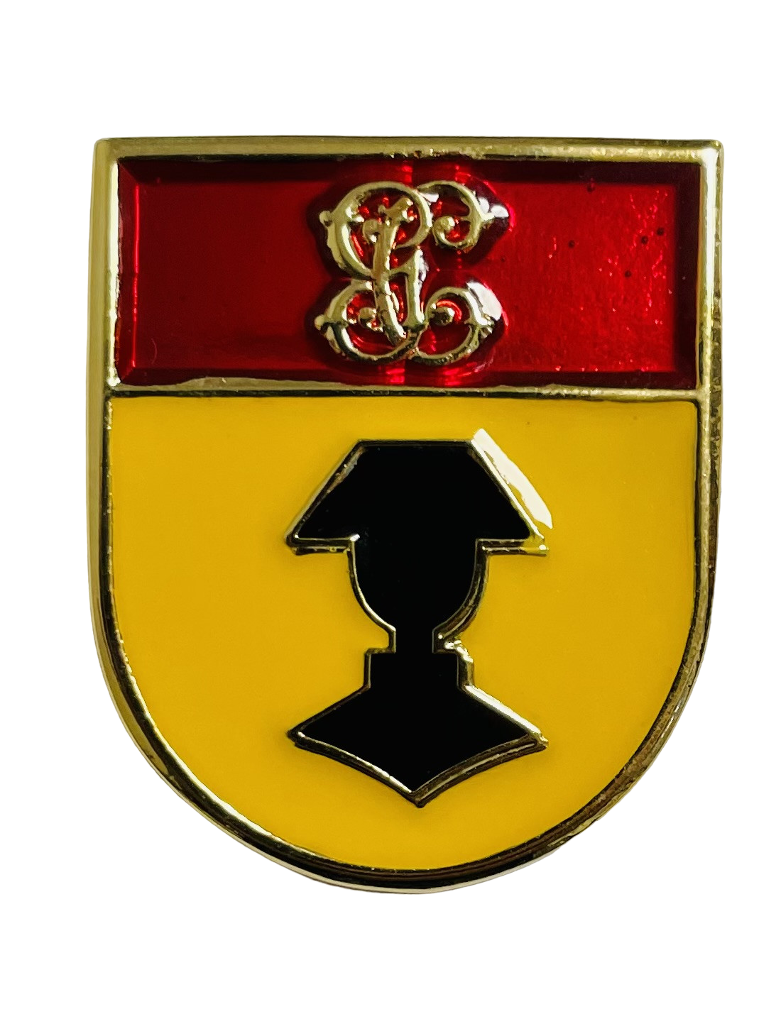 Escudo español cuadrilongo de 30 x 25 mm fileteado en oro. En campo de oro, silueta en sable de un guardia civil. El jefe de gules cargado de las letras G y C, de oro, entrelazadas.