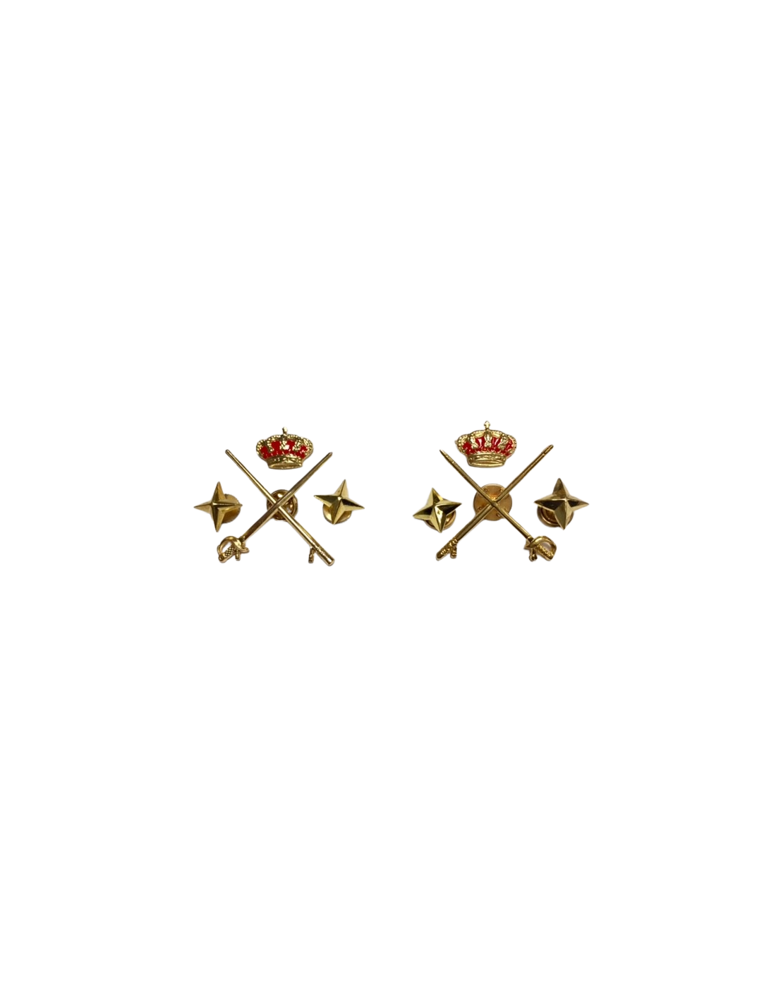 Sable en banda, bastón de mando pasante en aspa, con las empuñaduras en lo bajo, la cazoleta hacia arriba y las borlas colgando por el interior. Los cuatro extremos del bastón y del sable constituyen los vértices de un cuadrado imaginario, con cuyos lados coinciden los ejes mayores de las estrellas. En cada uno de los ángulos del aspa se dispondrá una estrella de cuatro puntas. El conjunto irá timbrado en lo alto por la corona real. Todos los elementos que constituyen la divisa serán dorados, excepto el forro de la corona que será rojo.