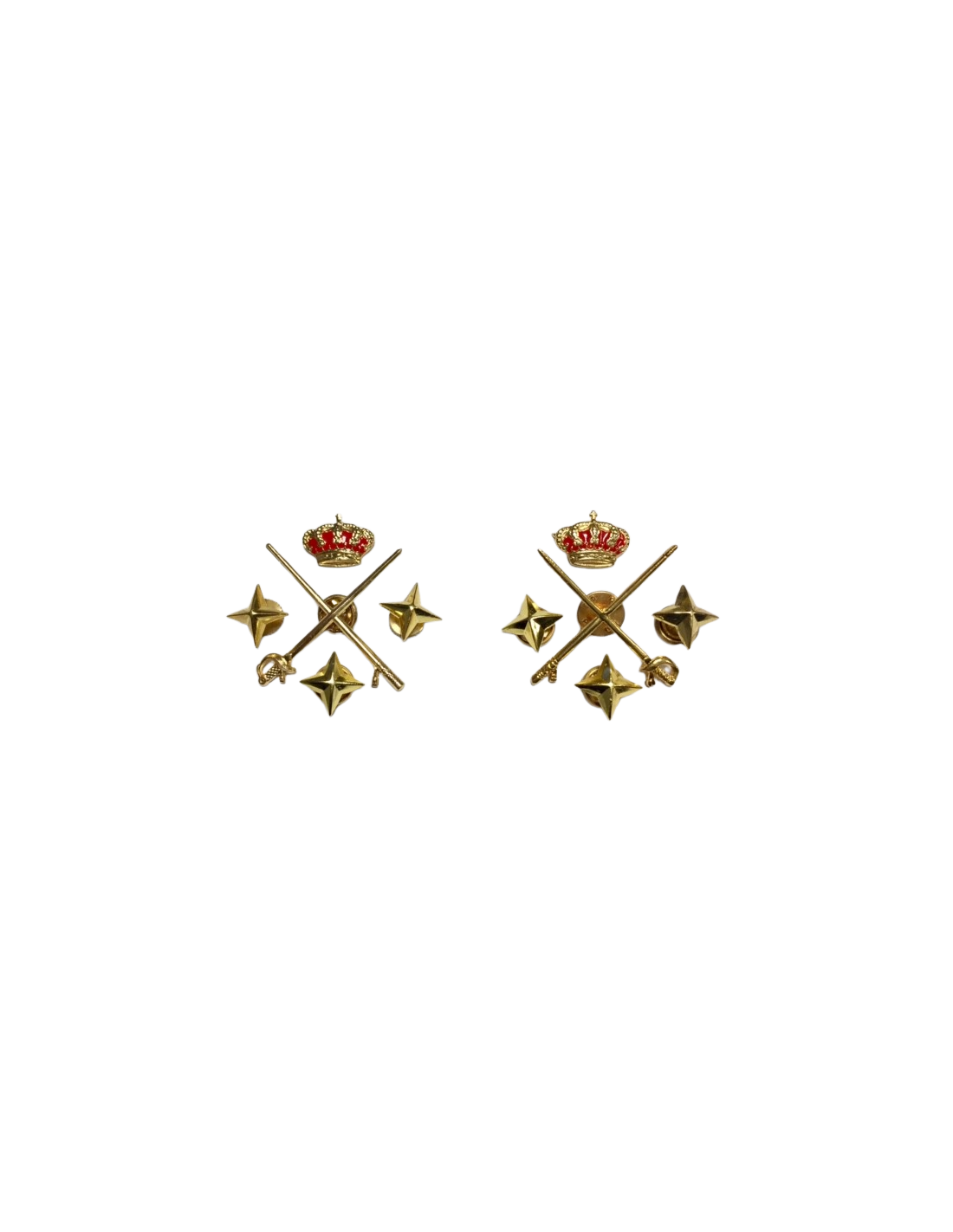 Sable en banda, bastón de mando pasante en aspa, con las empuñaduras en lo bajo, la cazoleta hacia arriba y las borlas colgando por el interior. Los cuatro extremos del bastón y del sable constituyen los vértices de un cuadrado imaginario, con cuyos lados coinciden los ejes mayores de las estrellas. En cada uno de los ángulos del aspa se dispondrá una estrella de cuatro puntas. El conjunto irá timbrado en lo alto por la corona real. Todos los elementos que constituyen la divisa serán dorados, excepto el forro de la corona que será rojo.