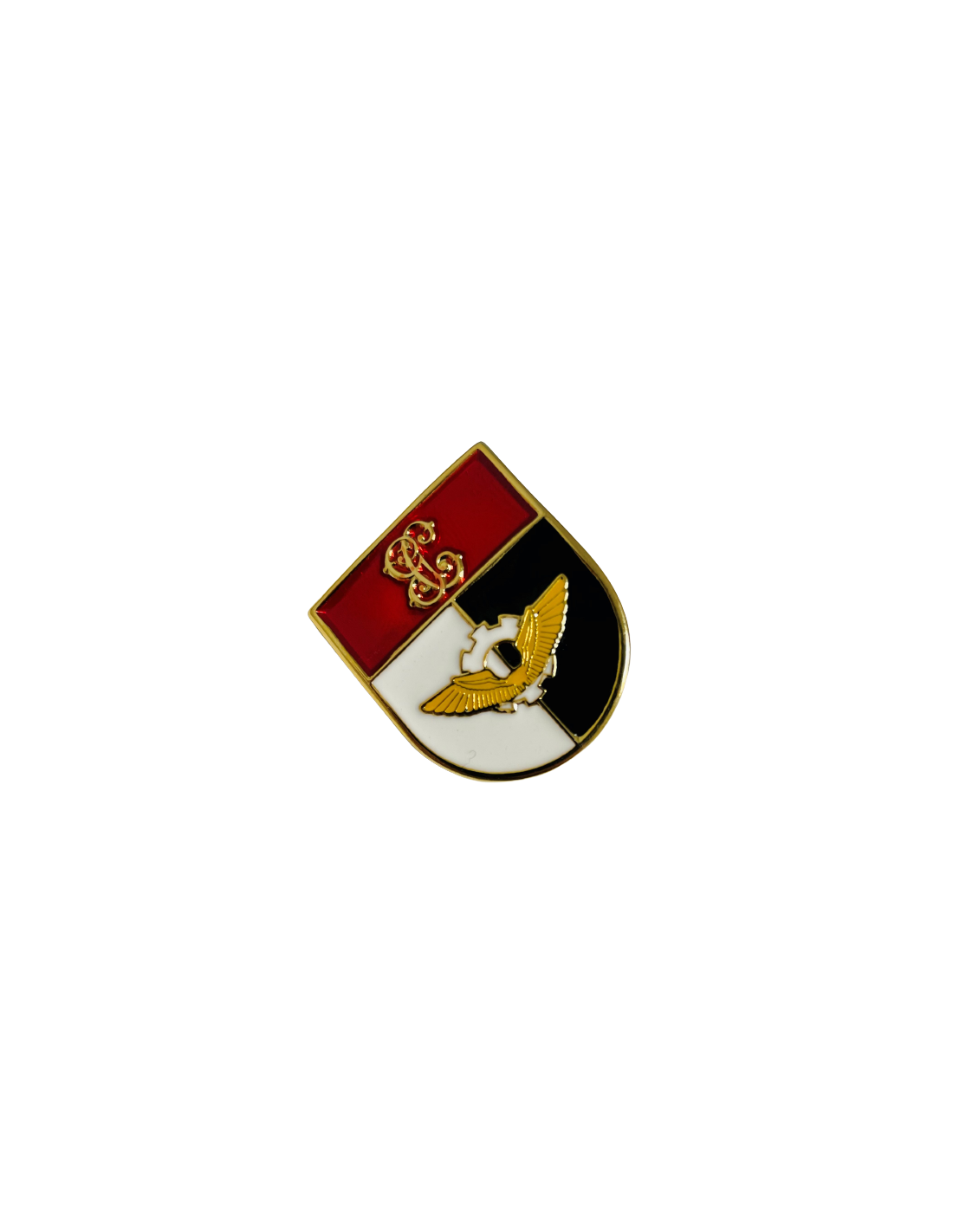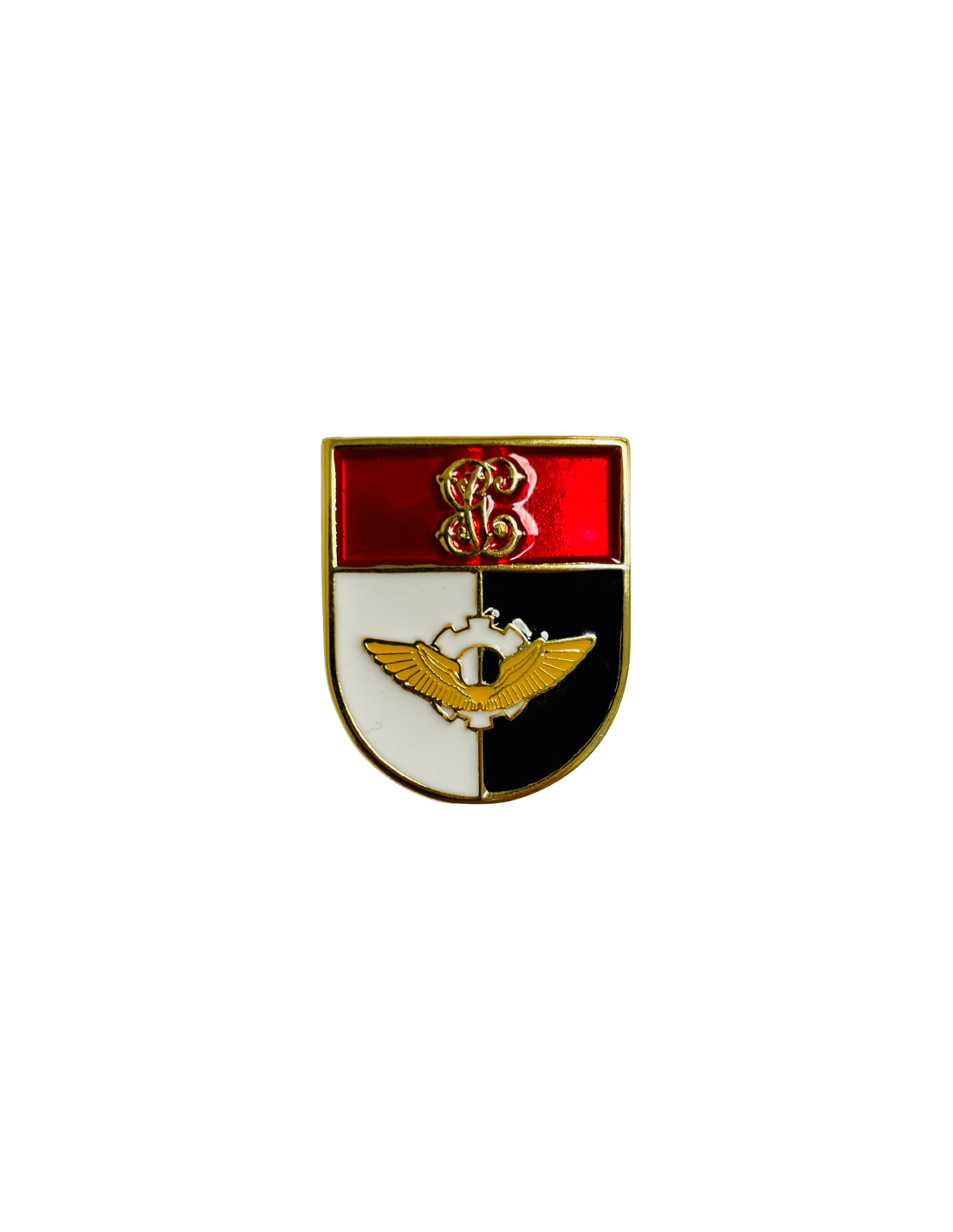 Descripción: Escudo español cuadrilongo de 30 x 25 milímetros. En campo partido de blanco y sable. Sobre todo, una rama dentada de plata de ocho dientes, cargada de unas alas en vuelo, de oro. El jefe de gules cargado de las letras G y C, de oro, entrelazadas. 3.2.- Derecho al uso: Todos los que estén en posesión de alguno de los diplomas de los cursos de especialización de las modalidades; mecánico de avión (AEMA), mecánico de helicóptero (AEMH), mecánico de aeronaves (AEMAER), y Oficial de mantenimiento (AEOF), dentro de la especialidad Aérea (AER).