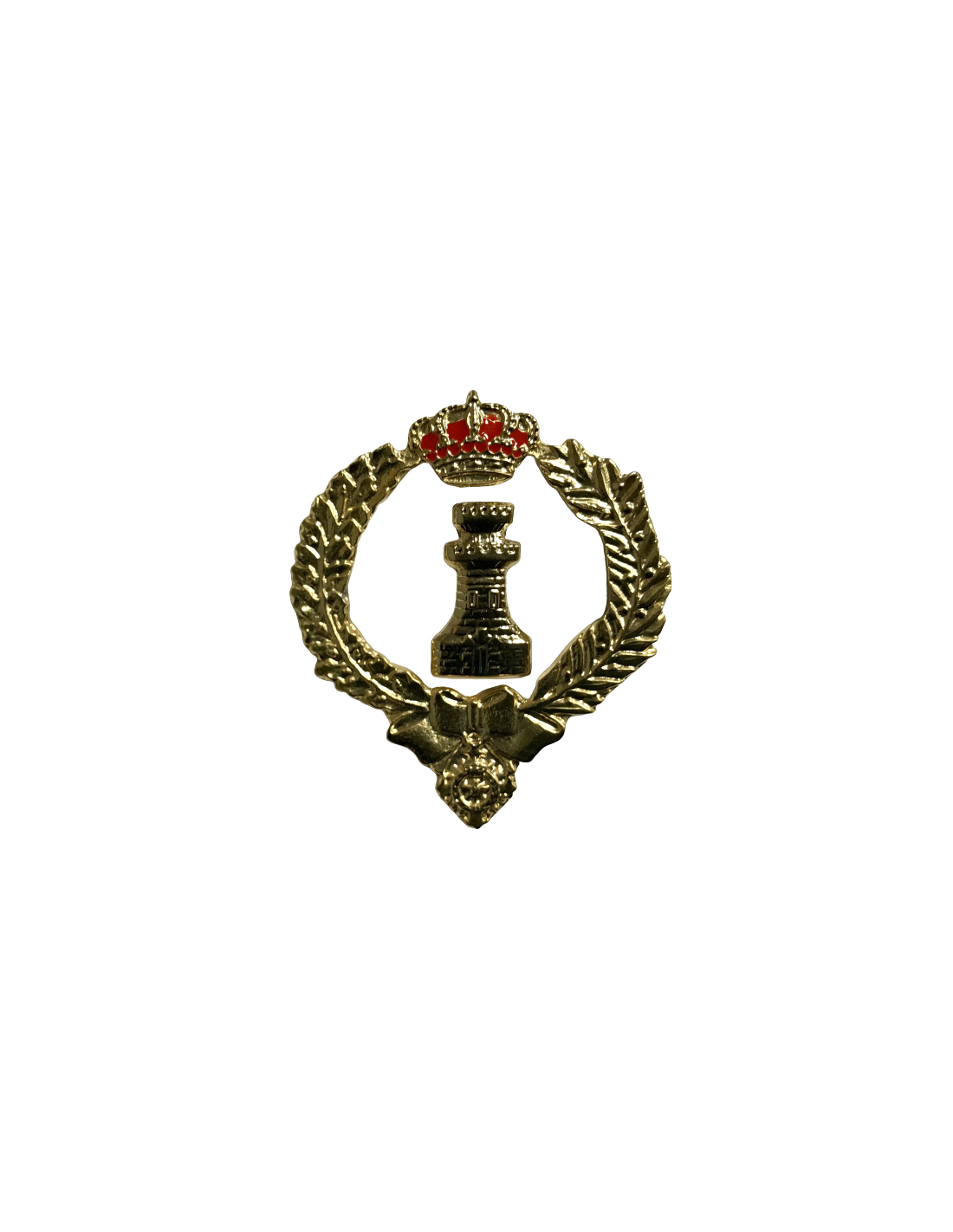 Torre donjonada, almenada de seis almenas visibles en dos saeteras en cada uno de los cuerpos de la torre, con puerta, mazonada de negro, orlada de dos ramas, de roble a la diestra y de laurel a la siniestra, nervadas y frutadas liadas en punta; en lo bajo placa de la Orden civil de Alfonso XII, todo de oro, timbrado de corona real de oro con forro rojo. Se usará en la boina.
