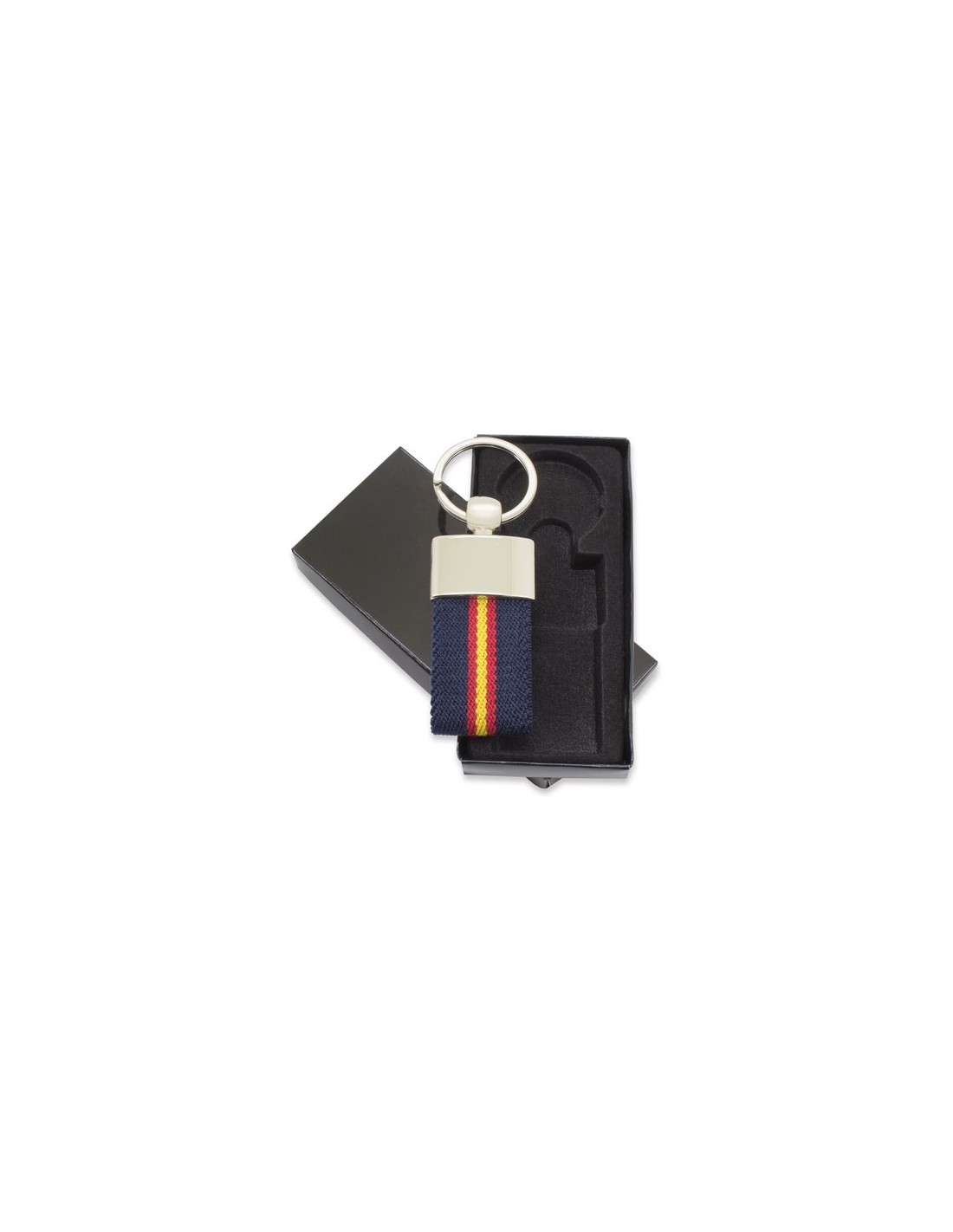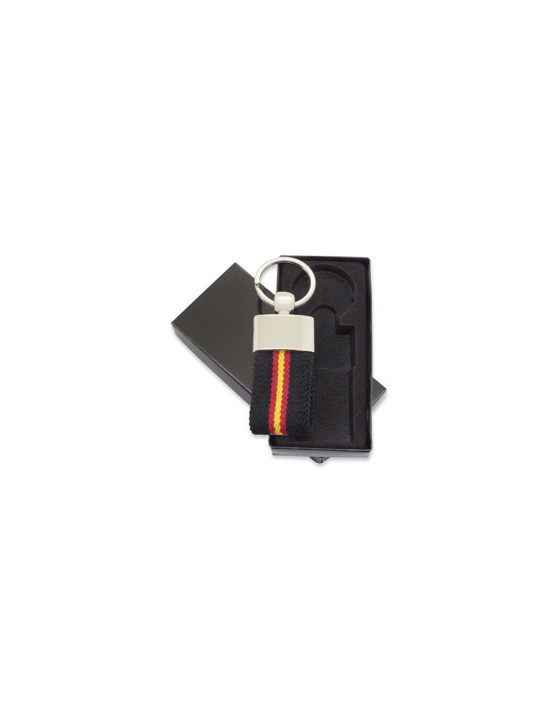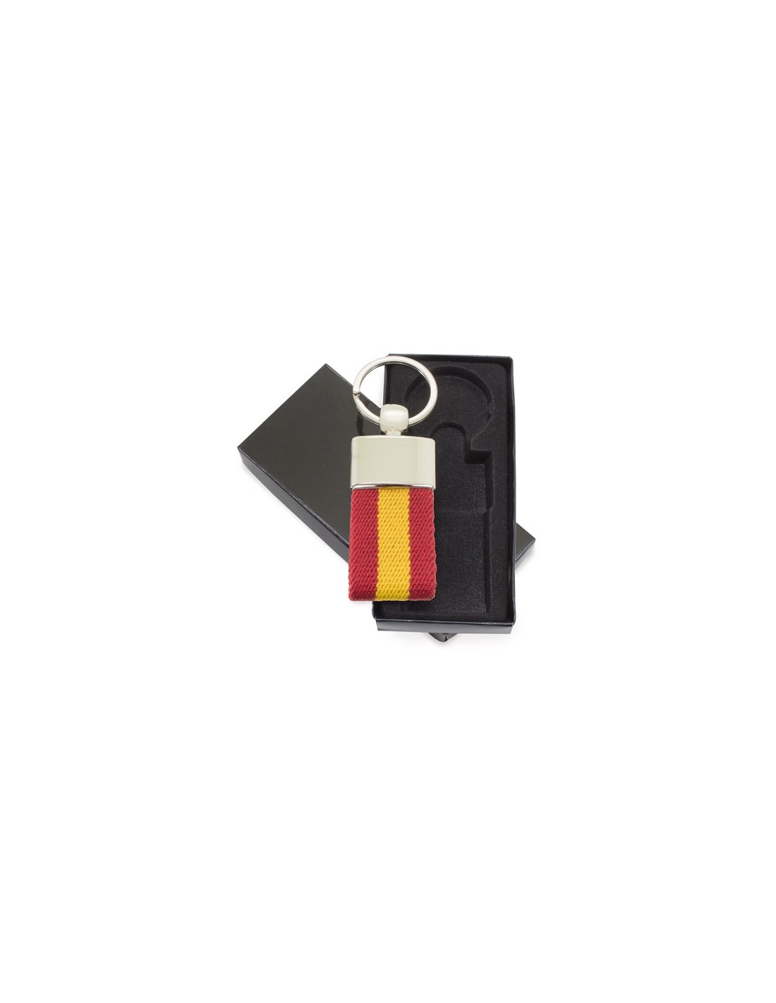Llavero de poliéster y Metal niquelado con de bandera española en la cinta y grabación incluida a laser.