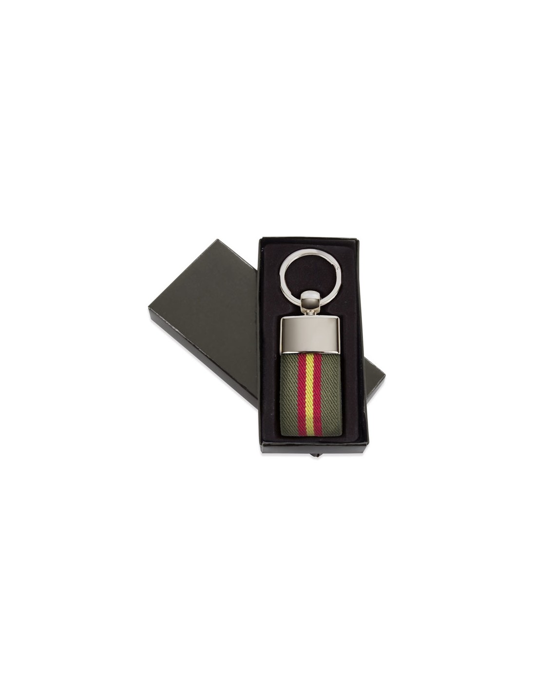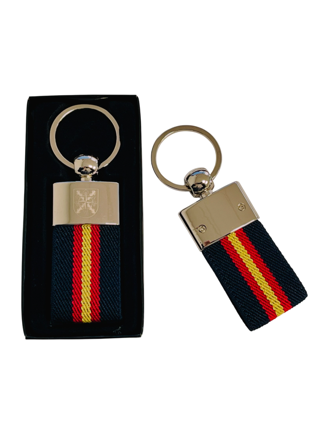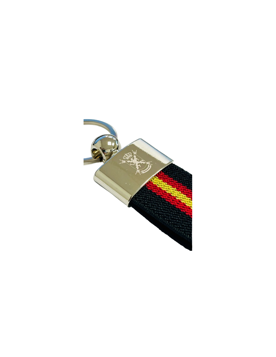 Llavero de poliéster y Metal niquelado con de bandera española en la cinta y grabación incluida a laser.